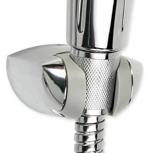 soporte de ducha orientable zac para flexibles con tuerca cónica, fabricado en termoplástico color cromado y gris.