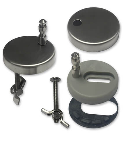 recambio juego de fijación con balancín para tapa wc issa - alba - tula - naya(1botón) - sara - dita - ema, embellecedores blancos, fabricado en acero inoxidable y termoplast.
